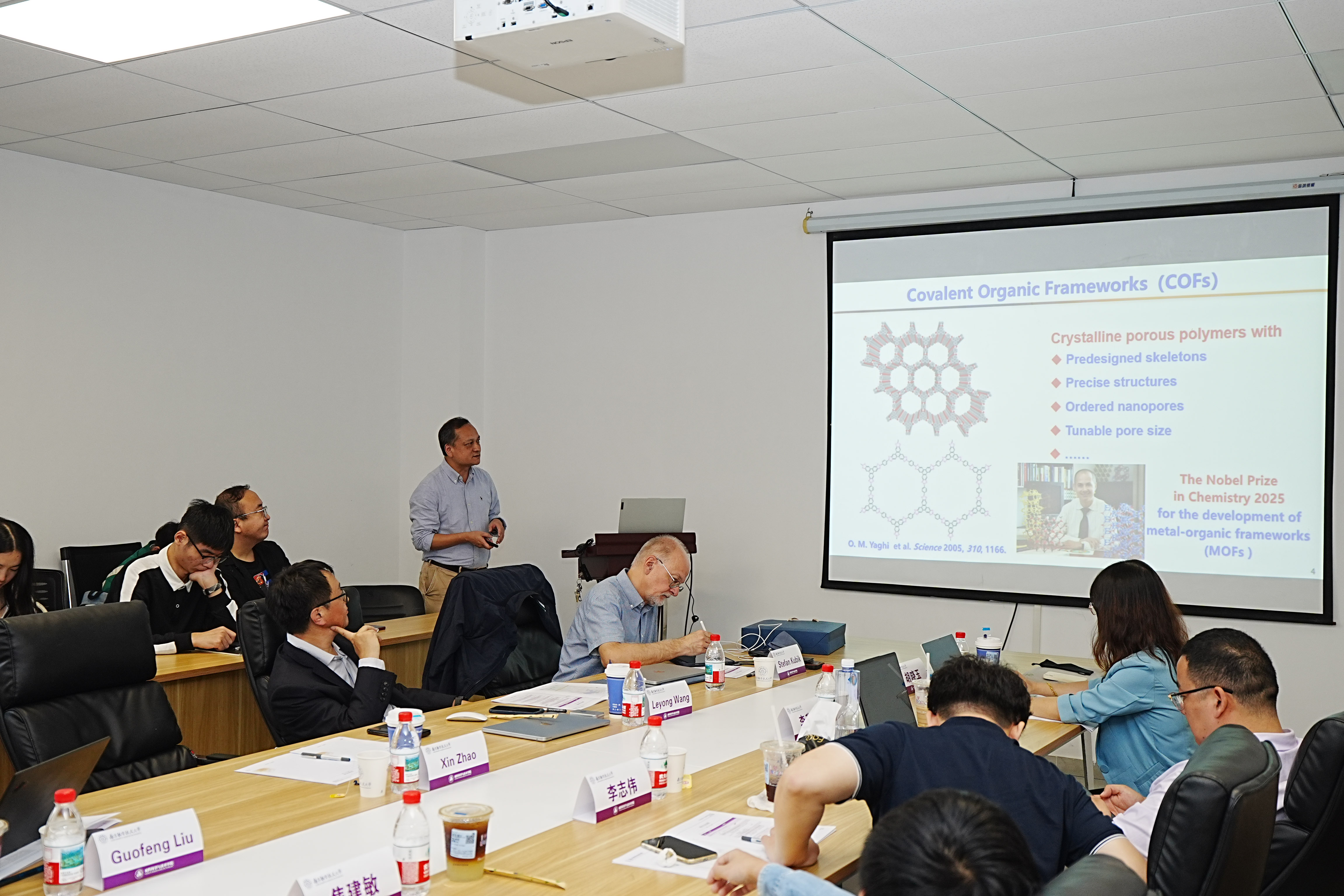 在学术报告环节,中德两国专家学者围绕超分子组装的调控机制、功能材料的精准构筑等核心议题展开了深入交流,系统分享了各自领域的最新研究成果,现场学术氛围浓厚。德国凯泽斯劳滕大学Stefan Kubik教授系统阐述了环肽分子在超分子识别中的创新性应用,其前沿研究引发了与会者的热烈讨论与深度互动。南京大学王乐勇教授详细介绍了具有空腔内活性结合位点的功能性大环芳烃在分子识别与催化反应中的潜在应用价值,为新型超分子功能材料的设计提供了重要思路;东南大学赵新教授则聚焦于共价有机框架材料的高效合成策略及其在储能与分离领域的实际应用前景,研究成果展现出显著的产业化潜力。此外,同济大学刘国锋教授、南通大学李升可教授、南京航空航天大学王开亚副教授,以及江西师范大学青年教师李志伟、焦建敏、田雪琪等分别就超分子手性调控、新型芳烃合成方法、超分子纳米反应器构建等前沿方向作了专题报告,进一步拓展了会议的学术广度与研究深度。
