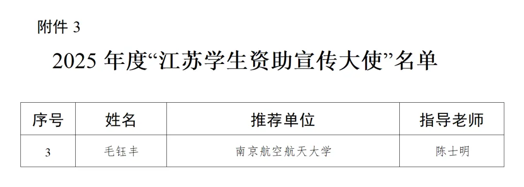 近日,江苏省教育厅办公室发布《关于公布2025年“苏乡永助”资助育人主题活动结果的通知》,我院2022级核工程与核技术专业本科生毛钰丰同学荣获“江苏学生资助宣传大使”称号。