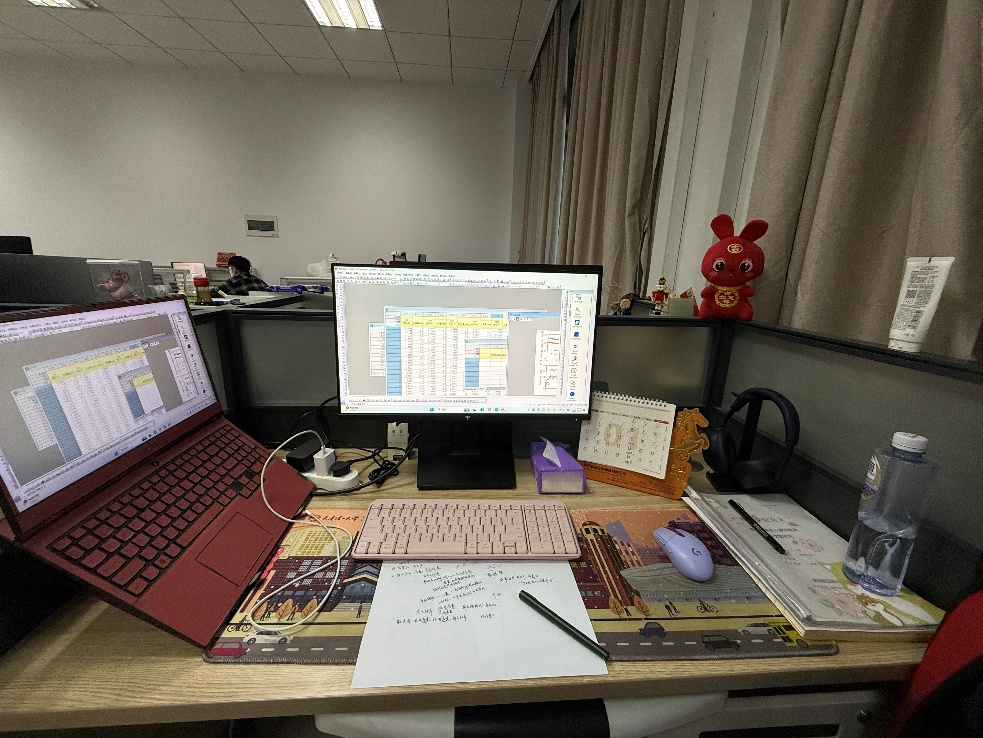 我的工位,是科研征途上令我倍感安心的专属领地。粉色键盘映衬下的笔记本电脑,触手可及的笔记本与文件夹,它们默默见证了我无数个沉浸于思考与书写的时光。耳机与排列有序的钢笔,每一件都镌刻着我求知的印记。椅背上,常备的靠垫给予我舒适的支撑,偶尔,一只红色小兔玩偶也会静静守候在一旁。每当我落座于此,心便自然而然地沉静下来。这个属于我的小小角落,早已超越了工位的定义,它是我安心探索、稳步成长的起点。